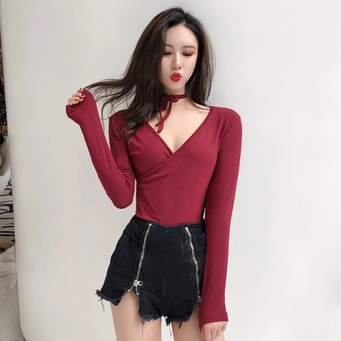 Best Photo Shoot ~ Early Autumn Fashion Lace-up V-neck Chest Emphasizing Large Cross Slim Fit Long Sleev