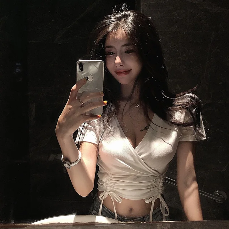 Review Top Photo Shoot ~ Summer Sexy V-neck Low-Cut Drawstring Slim Fit Solid Color Slimming Elasticity Short